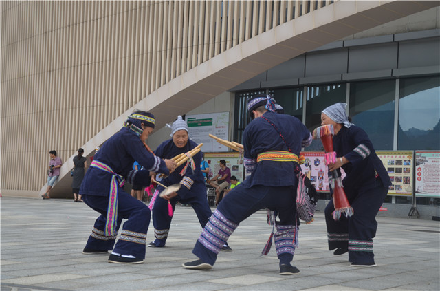 6月8日至9日期间,市群艺馆在市文化艺术中心分别开展了三个活动,包括民俗活态展示、非遗政策法规及贺州市非遗项目成果宣传展、服饰文创产品展等。端庄、隆重的瑶族服饰一出场就惊艳了全场观众,一套套色彩艳丽的精美服饰展现在眼前,观众们纷纷表示眼睛都不够看了。由富川瑶族同胞带来的瑶族原生态芦笙长鼓舞,情节生动、舞姿刚健粗犷,曲调旋律宽广、极具民族特色,体现了富川瑶胞对美好生活的向往和追求。现场织锦聚集了广场周围市民前来围观,有些市民还现场学起来,“一针一线,古时候要做一件衣服真是不容易啊。”,现场学习织锦的市民表示。
