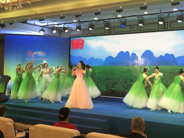 为全面对接粤港澳大湾区,加快建设广西东融先行示范区,推动文旅产业高质量发展,12月2日,贺州市人民政府与自治区文化和旅游厅联合在广东省珠海市举办2020年广西(贺州)文化和旅游产业暨黄姚古镇文化和旅游产业示范区宣传推介合作洽谈会。我馆舞台艺术精品《幸福有约》、《我在长寿之乡等你》等作为宣传推介和文化交流节目参加了洽谈会,以完美的艺术呈现得到了与会嘉宾的一致称赞。