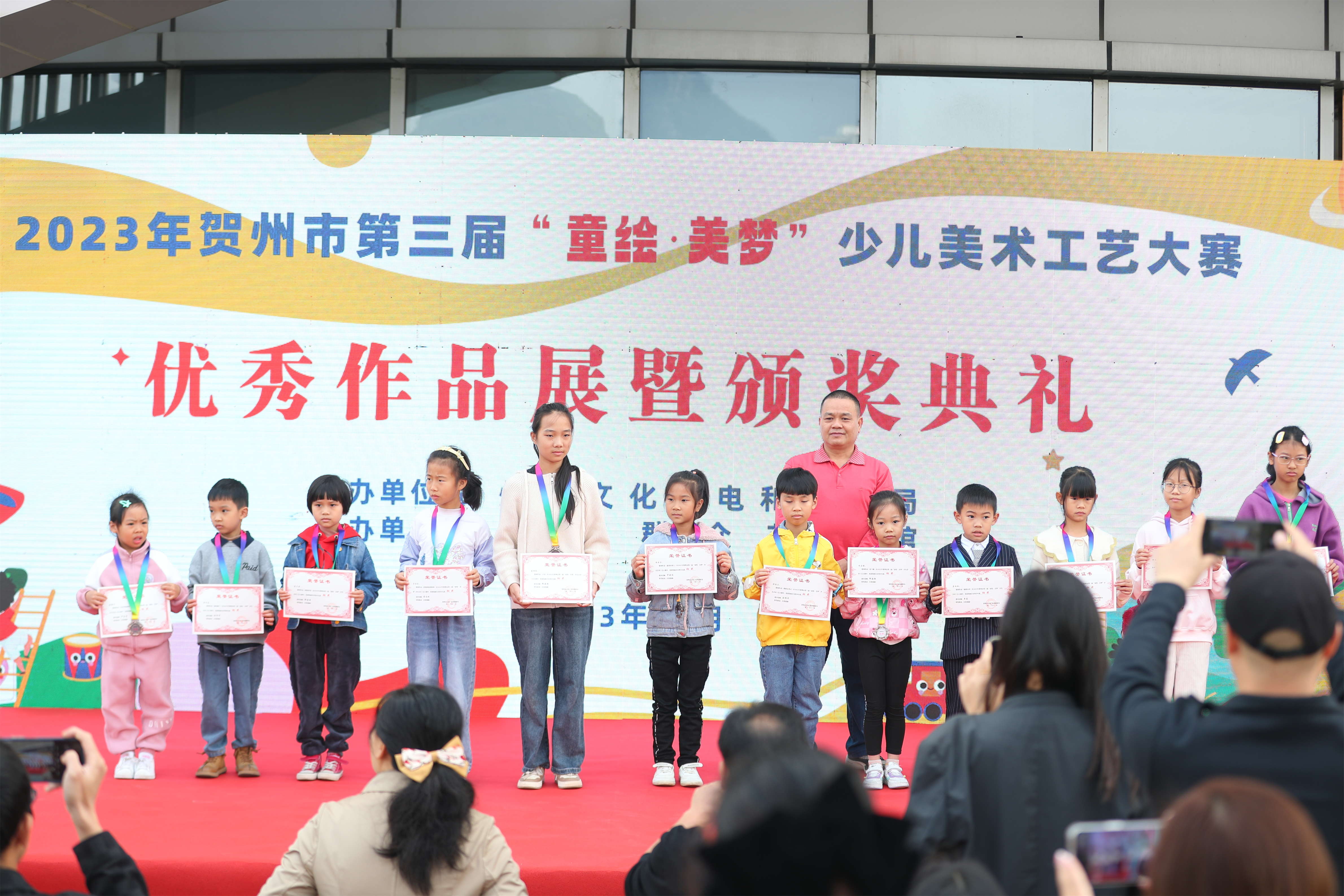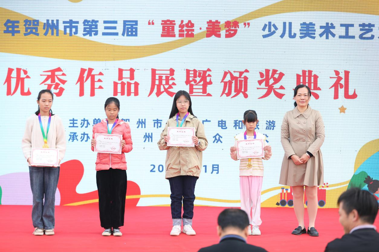 2023年11月25日上午,由贺州市文化广电和旅游局主办,贺州市群众艺术馆承办的“2023年贺州市第三届‘童绘.美梦’少儿美术工艺大赛”优秀作品展暨颁奖典礼在贺州文化艺术中心贺州市群众艺术馆门前广场举行。贺州市文化广电和旅游局及贺州市群众艺术馆有关领导、负责人和老师分别为获奖的小朋友进行颁奖。